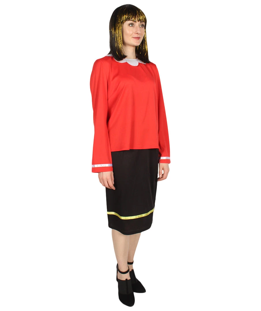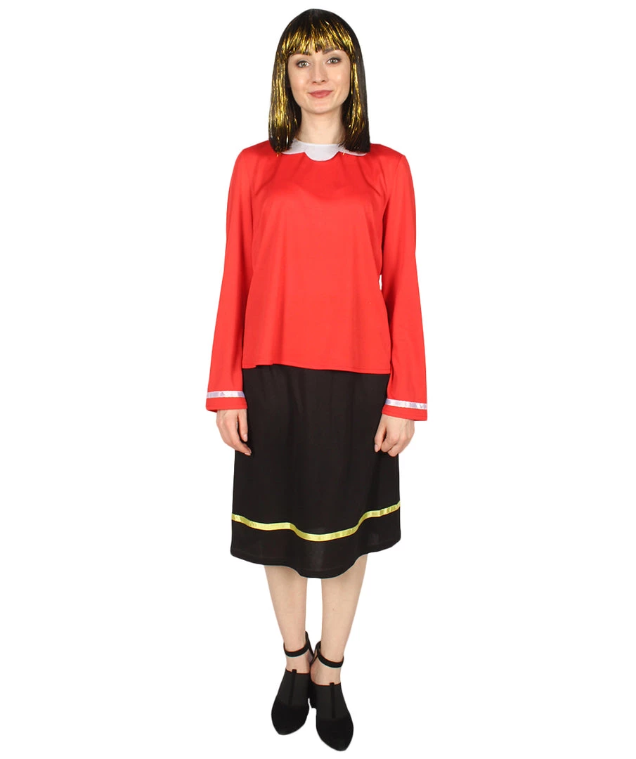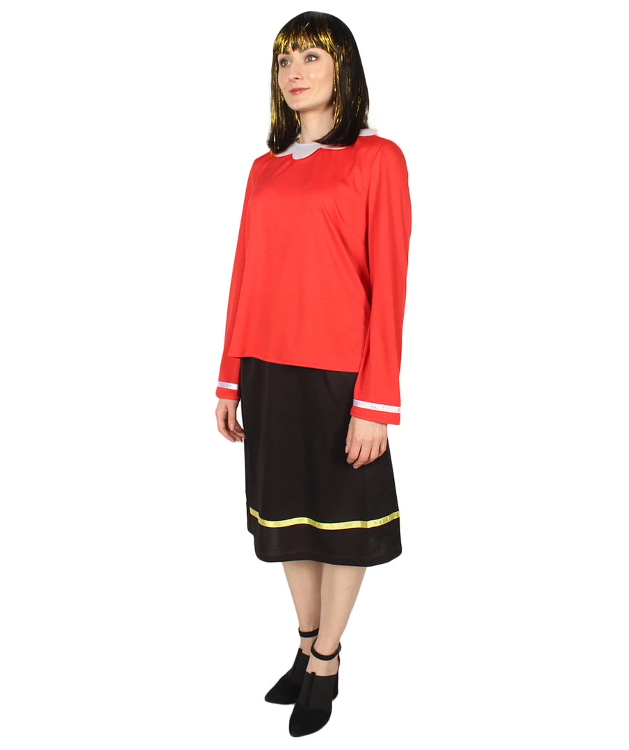 This Olive Oyl dress cosplay costume is a perfect match with a large variety of wigs on our website, purchase this costume today and be ready for your next carnival event or Halloween party! Famous for being Popeye’s girlfriend in the popular Popeye the Sailor Man comic strip and television series. She is constantly being taken away by Popeye’s enemy Bluto and Olive Oyl is usually annoyed with Popeye. However, when Popeye saves the day, they fall in love again. Featuring Olive Oyl’s dress, signature red shirt with white details around the cuff and black skirt with yellow details, this is a great looking costume that’s easy and quick to put together. Purchase our Popeye the Sailor Man costume and you can dress up as a couple! Our HalloweenPartyOnline wigs offer the latest styles for your next cosplay event, carnival, or Halloween party!