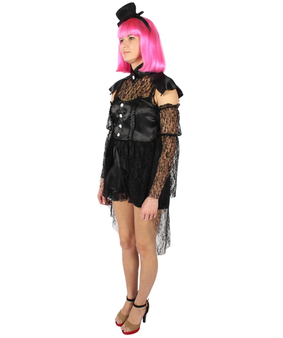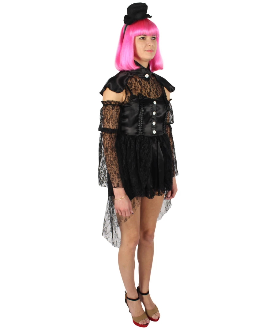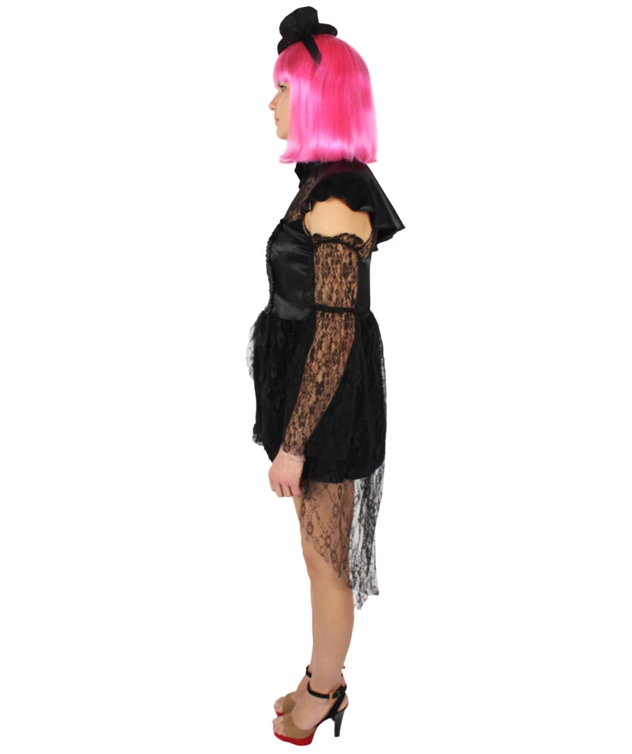 Prepare yourself to embody this poised, mysterious, and utterly composed character from a classic book series with our dreadfully elegant satin black lace costume. It’s not just a costume, but a true element of seductive and formidable beauty. With this costume, things are going to get eerie at your next costume or cosplay party! This 45-inch zip closure dress has an 8-inch cap. Ready to be dreadful in the best way?