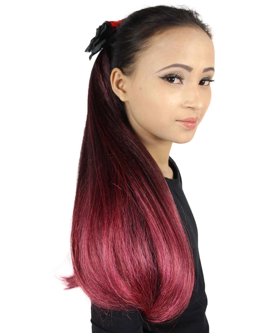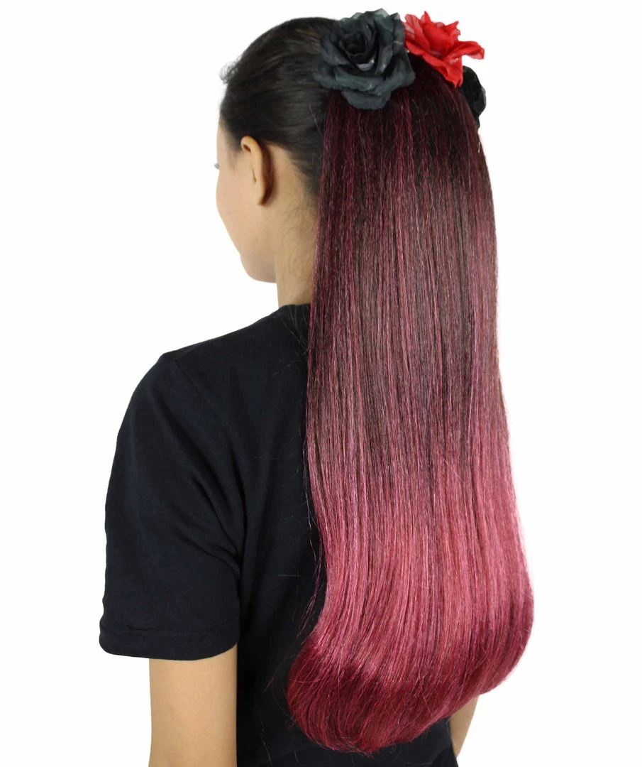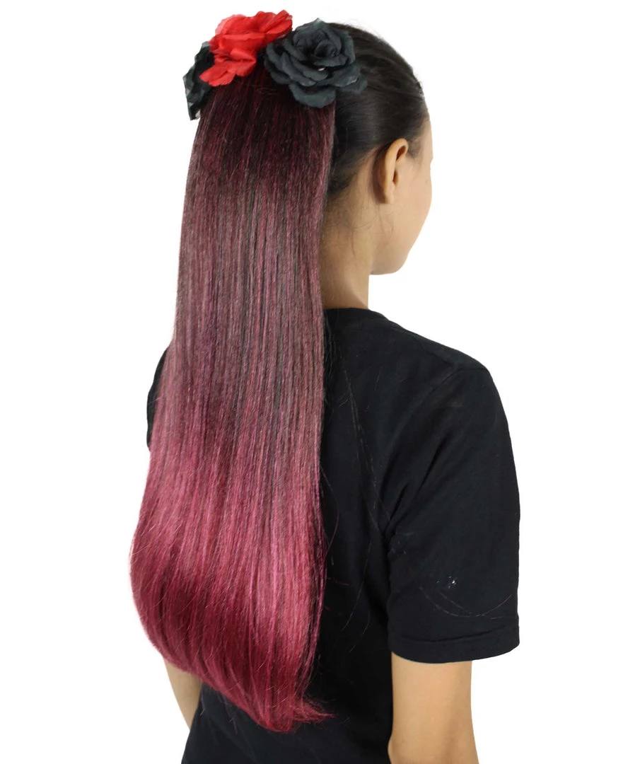 HPO Dotd Hair Clips | Women’s Long Length Day Of The Dead Hair Clips – Long Straight Black Hair – With Red Tinsel Strands And Colorful Flowers