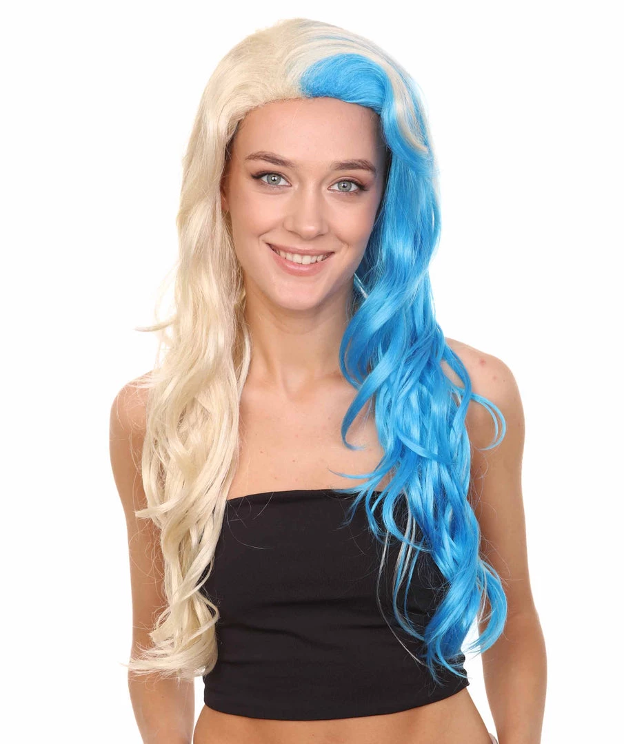 HPO Half Blonde And Half Blue Wig | Fancy Party Event Ready Halloween Wig | Premium Breathable Capless Cap