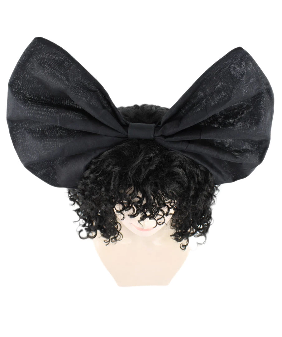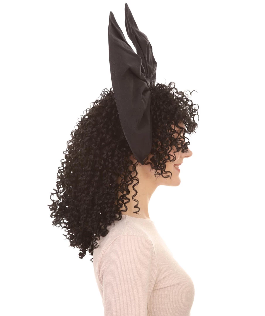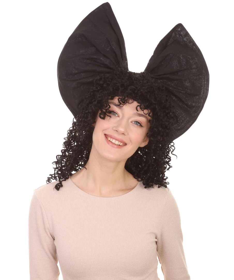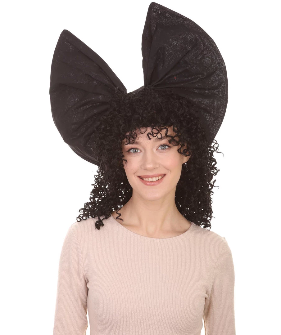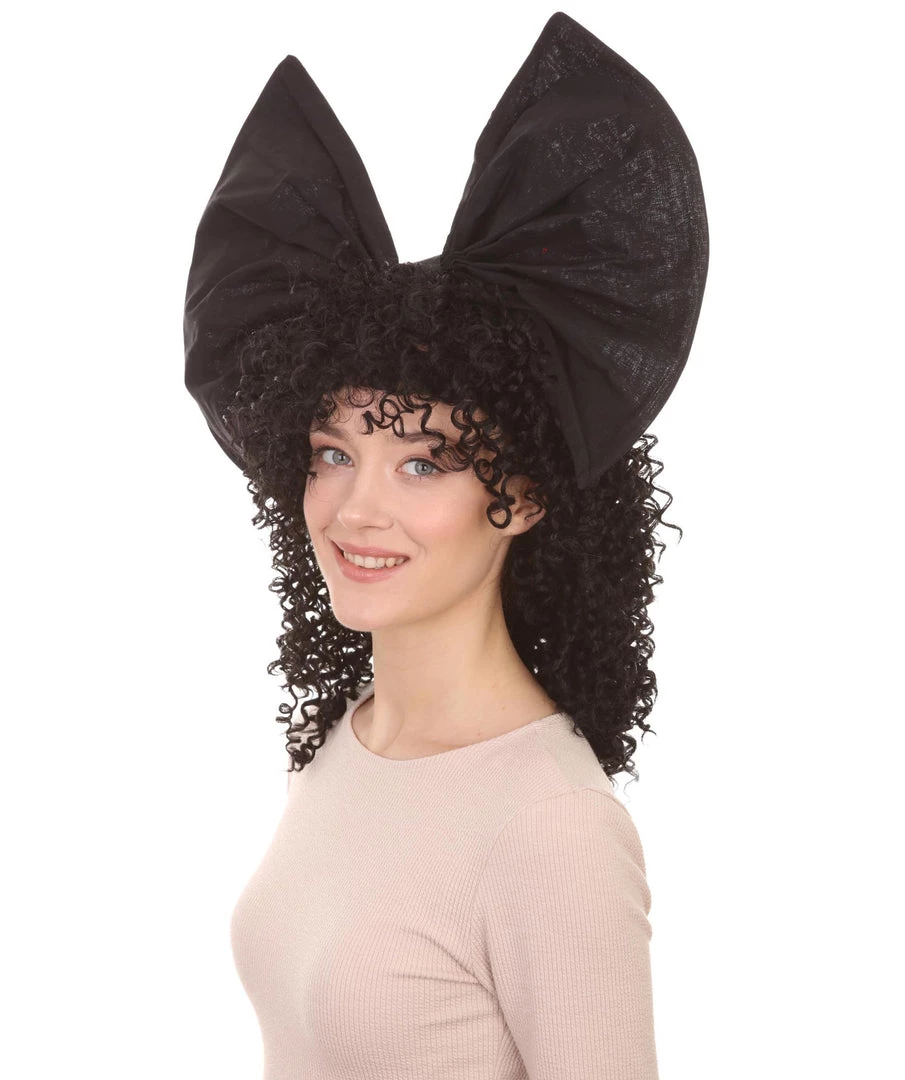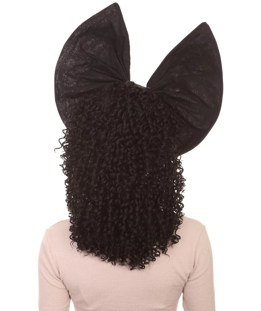 HPO Men’s Australian Singer Curly Womens Wig | Large Black Bow Cosplay Halloween Wig | Premium Breathable Capless Cap