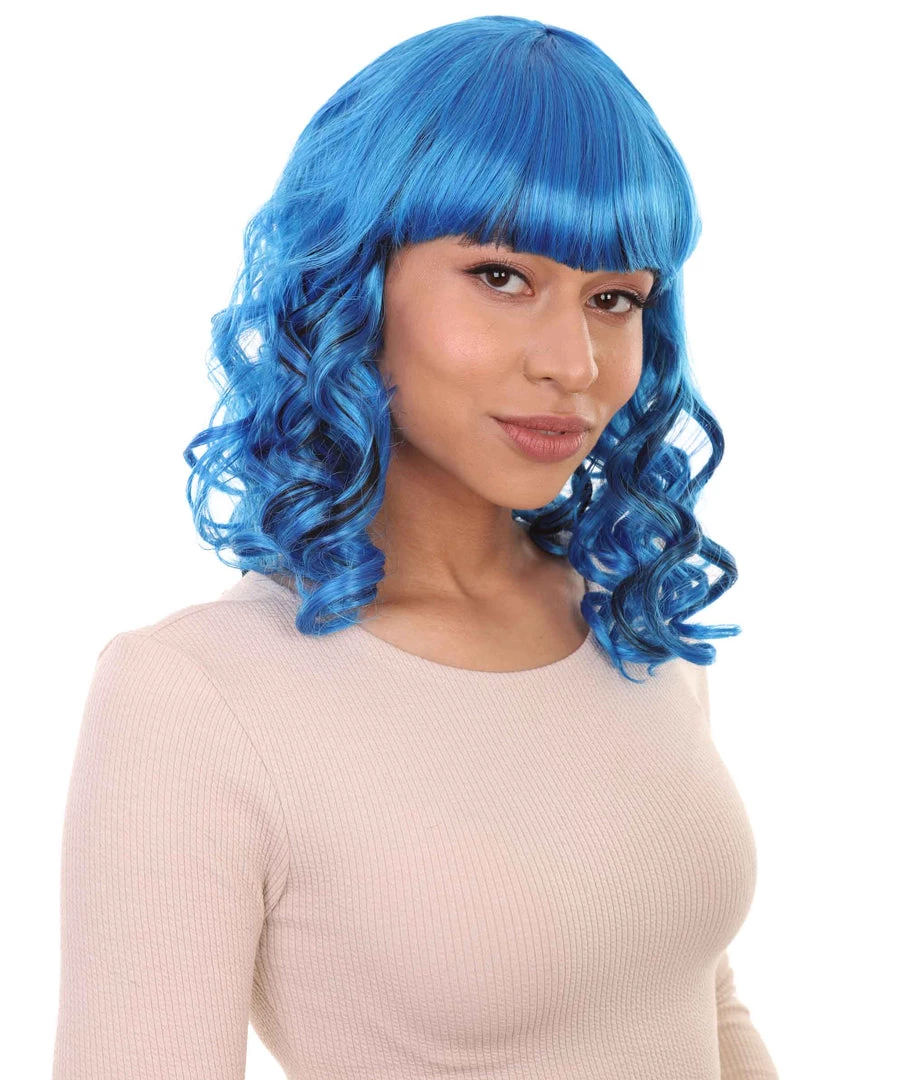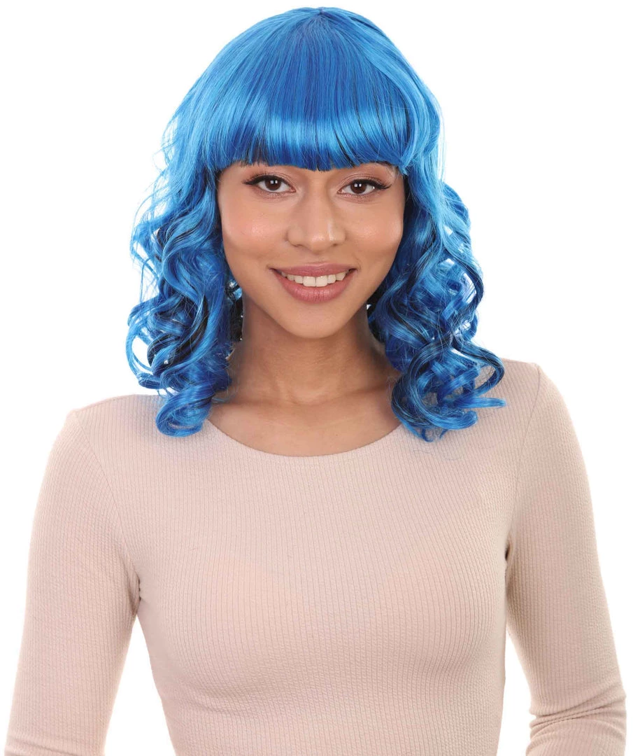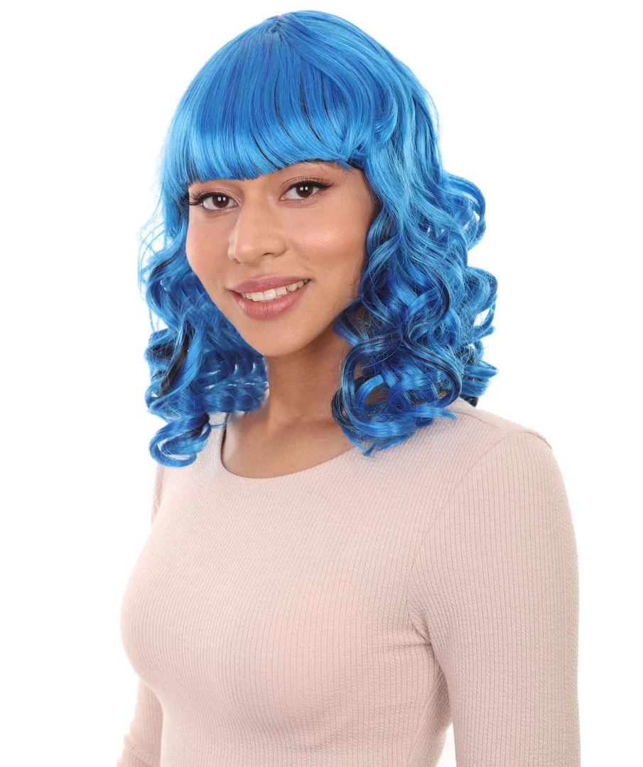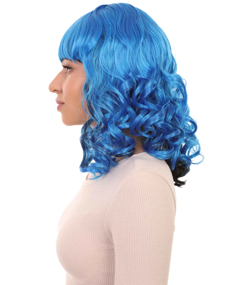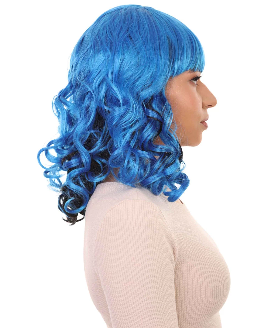 HPO Men’s Blue Wavy Womens Wig | Medium Curly Cosplay Halloween Wig | Premium Breathable Capless Cap