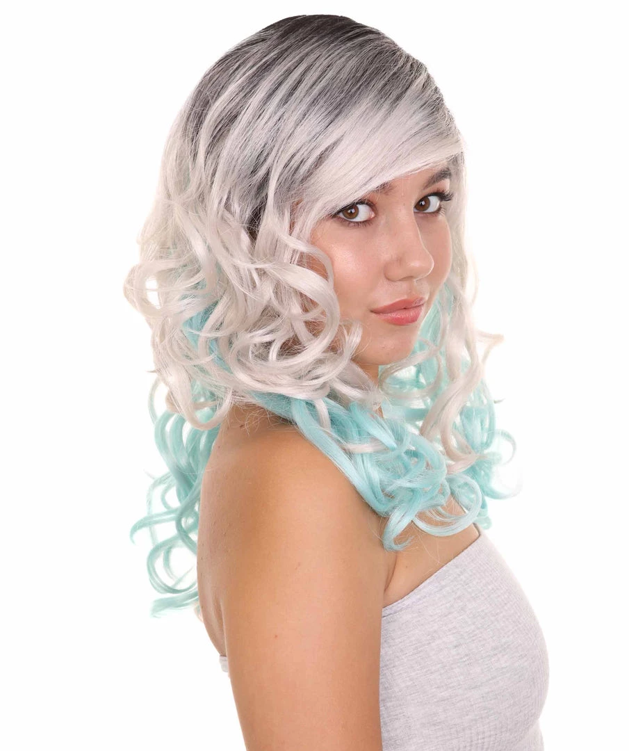 HPO Men’s Long Wavy Grey And Blue Ombre Womens Wig | Fancy Party Event Ready Halloween Wig | Premium Breathable Capless Cap