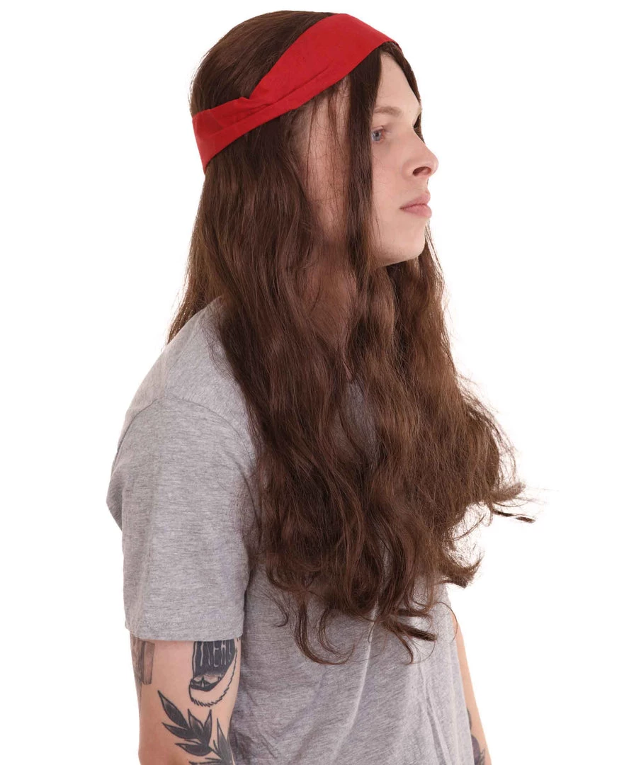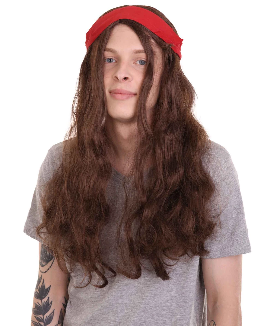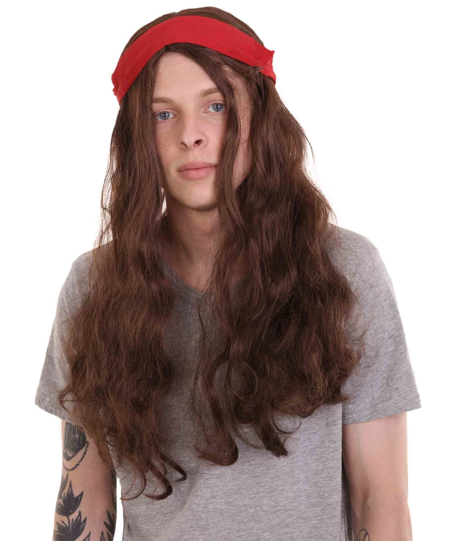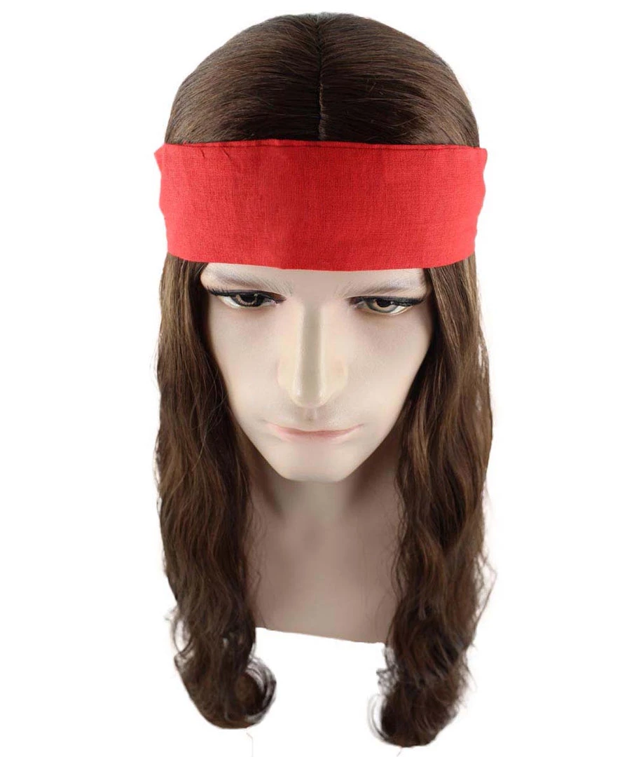 HPO Men’s Pirate Mens Wig | Brown Wig With Red Ribbon | Premium Breathable Capless Cap