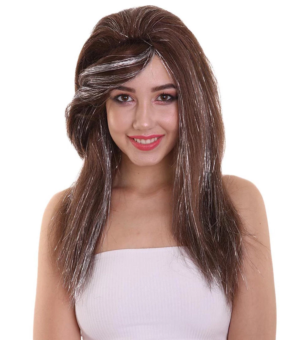 HPO Women’s 60’s Brunette Bouffant With Silver Tinsel Highlights | Halloween Rave Wig | Premium Breathable Capless Cap