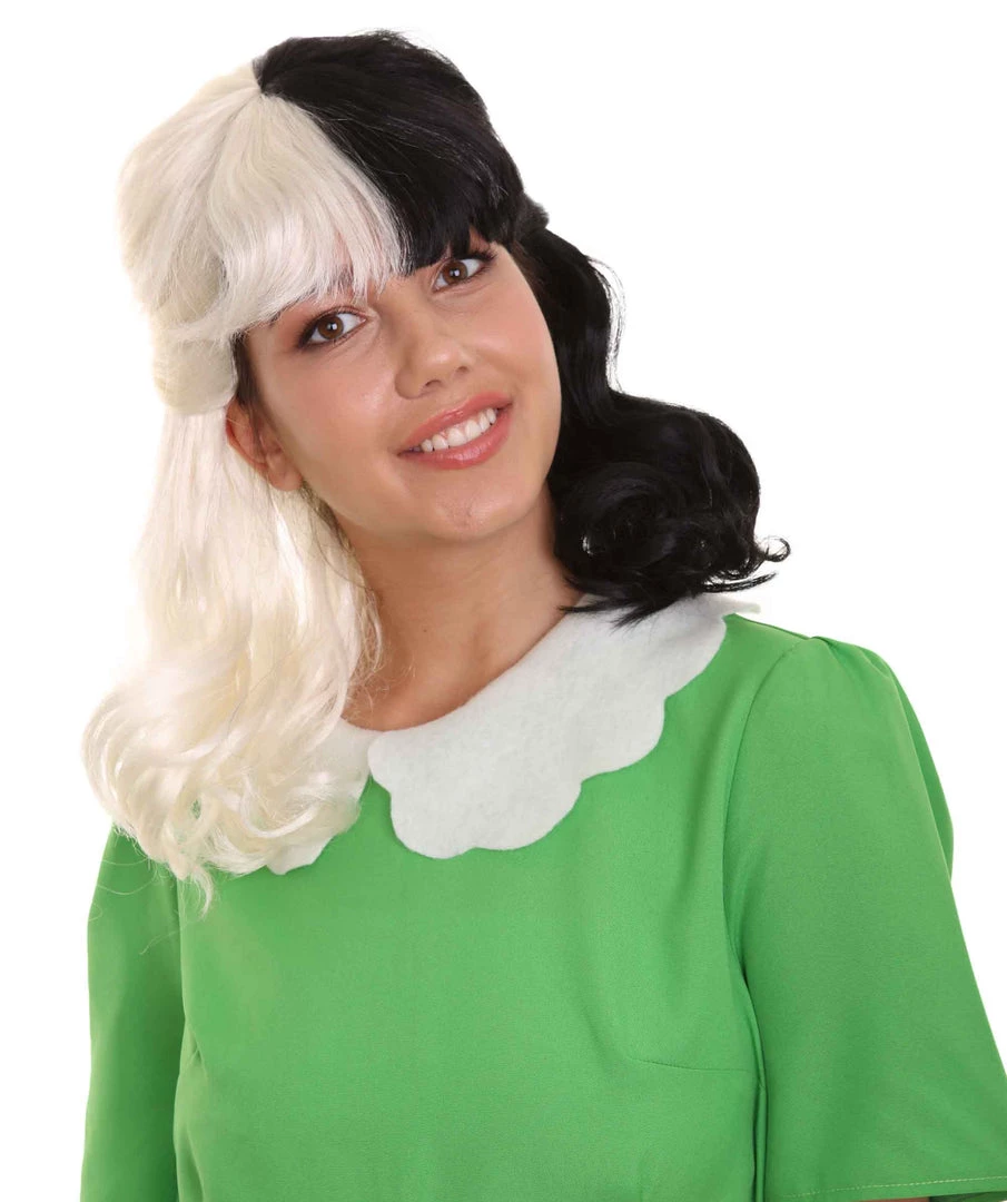 HPO Women’s Shoulder Length Contrasting Two Tone Cruel And Evil Wig – Pure White And Jet Black Hair – Capless Cap Design