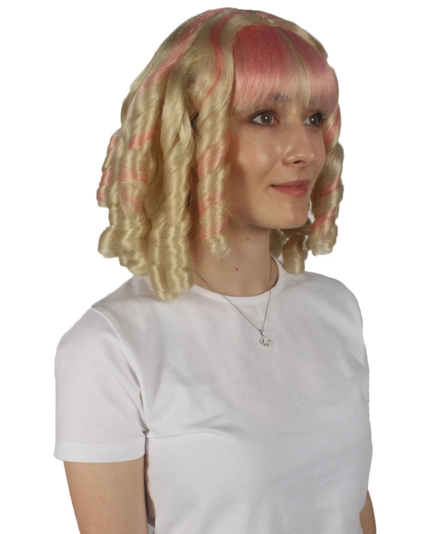 HPO Women’s Womens Colonial Historical Pink And Blonde Curly Wig | Premium Breathable Capless Cap