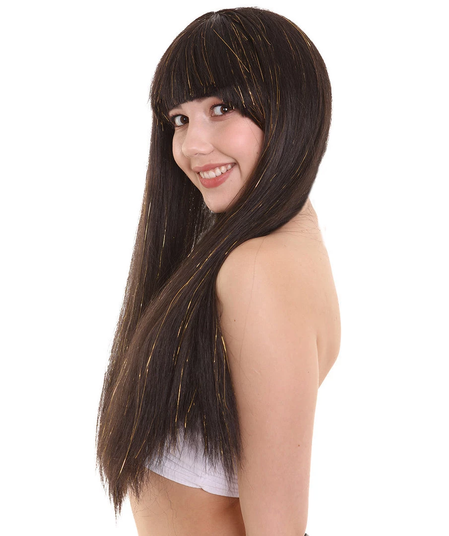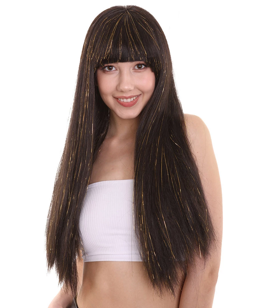 HPO Womens Egyptian Queen Long Straight Gold Tinsel Wig | Black & Gold Tinsel Historical Wigs | Premium Breathable Capless Cap