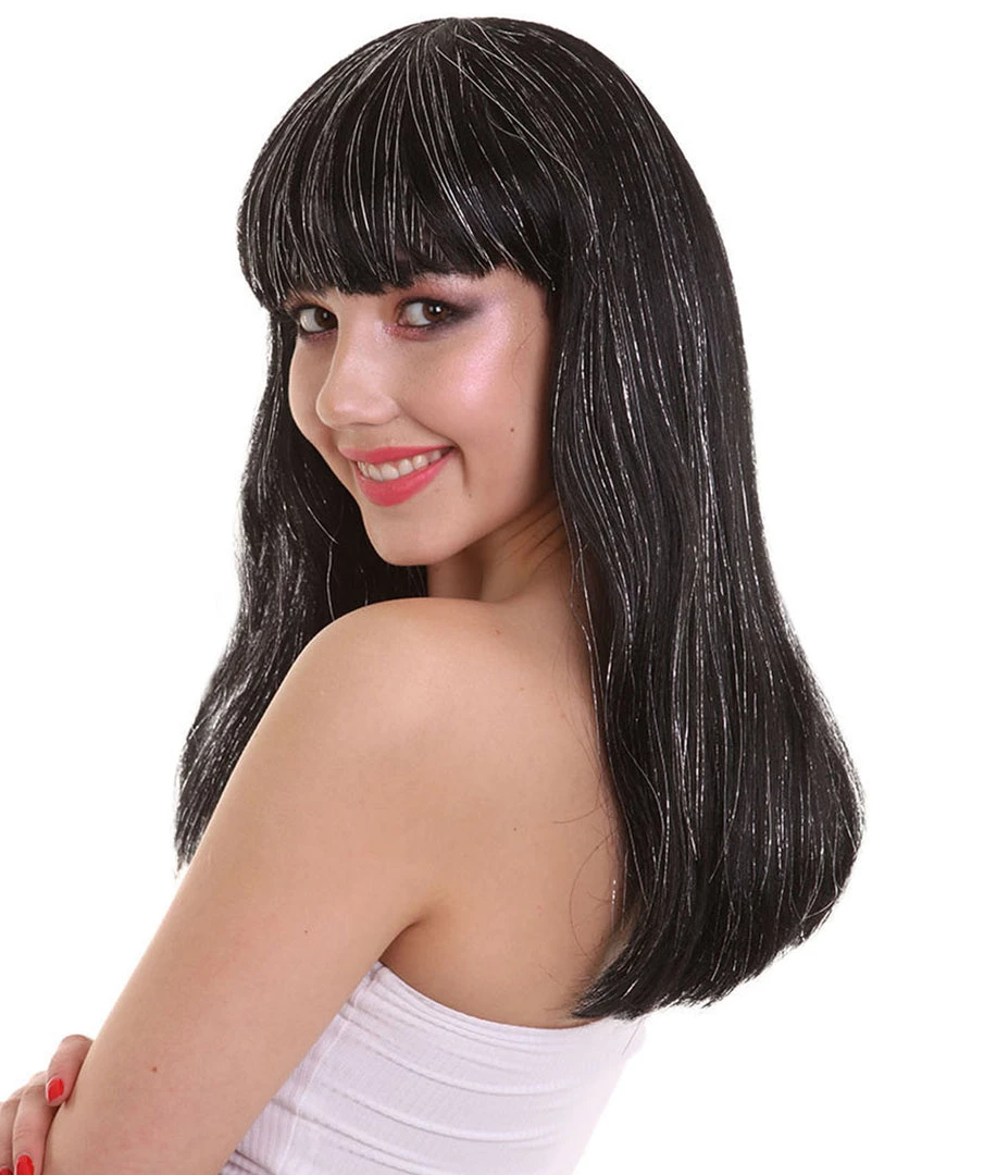 HPO Womens Long Black 90’s Bob With Silver Tinsel Highlights | Halloween Rave Wig | Premium Breathable Capless Cap