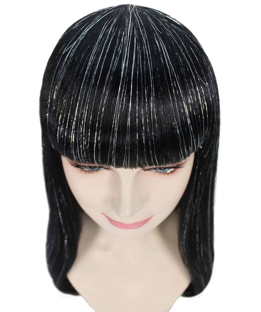 Be the first to review “HPO Womens Long Black 90’s Bob With Silver Tinsel Highlights | Halloween Rave Wig | Premium Breathable Capless Cap” Cancel reply